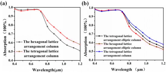 Meanwhile, in order to investigate the influence of the lattice arrangement and the scatterer shape on the absorption efficiency of the optical absorption layer, the case of hexagonal lattice arrangement and ellipsoidal scatterer was also discussed. The simulation results of the absorption efficiency are shown in Figure 13. As shown in Figure 13a, the absorption efficiency of the optical absorption layer where the scatterers are arranged in a hexagonal lattice is weaker than that of a tetragonal lattice in the wavelength range of 700–1200 nm. Figure 13b shows the change of absorption efficiency with different wavelength when the scatterers are ellipsoidal. When the scatterers are elliptic cylinders, the absorption efficiency is lower than that of the cylindrical scatterers, no matter in tetragonal or hexagonal lattices. It is more comprehensive and objective to conclude that the optimal structure of the absorption layer is the cylindrical scatterer arranged in a tetragonal lattice.