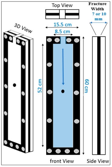 Figure 2 shows the confined rectangular model with the following dimensions: the length was 60 cm, and the fracture widths were 10 or 7 mm. Rubbers that were placed between the parallel glasses were used to represent the fracture width, as shown in Figure 2. This rectangular model has two parallel visible glasses to allow measuring and to capture the solid settling velocity. In this study, the parallel glasses have smooth walls roughness. In our previous work [26] we observed that increasing wall roughness reduces proppant settling velocity. The friction reducer filled in the parallel fracture model and was left for an adequate time (one day) to make sure there were no bubbles in the fracture model.