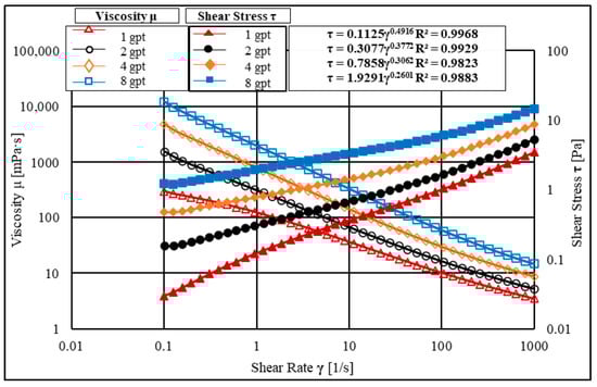Figure 4 shows that the viscosity of the HVFR fluids improved substantially with increasing concentration but only at a low shear rate and this observation is consistent with previous results obtained by [27]. At a shear rate of 10 s−1, the viscosities of the HVFR were 334, 136, 70, and 37 mPa·s for 8, 4, 2, and 1 gpt, respectively. However, at a high shear rate of 100 s−1, the viscosities of the HVFRs reduced to 63, 31, 17, and 11 mPa·s for 8, 4, 2, and 1 gpt, respectively. Additionally, the significant reduction in the viscosities of the HVFRs at a high shear rate might imply that the HVFR viscosity did not significantly impact proppant transport near the wellbore. Therefore, at high shear rates, the reliability of the fluid viscosity might not provide good sand transport, and the fluid would have to depend on its elasticity to hold the proppant in the fracture networks. Moreover, the insignificant changes in the viscosities of the HVFRs that were observed at higher shear rates (Figure 4) suggest that increasing the concentration of the HVFRs above a certain level would not continue to improve the HVFR viscosity.