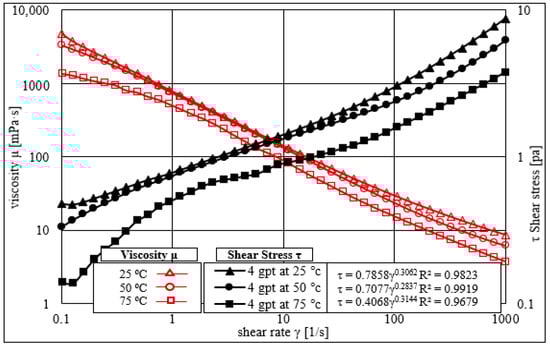 From the results presented in Figure 3 and Figure 4, a concentration of 4 gpt was selected for further laboratory investigations. Four temperature ranges (i.e., 25, 50, 75, and 100 °C) were used to understand the thermal stability of the HVFRs. A rheometer was used to investigate the impact of changing temperature of HVFR rheological properties. Figure 5 shows the impact of increasing the temperature above room temperature (25 °C) on the shear rate and shear stress profile for friction reducers of 4 gpt. The results using the HVFRs showed good resistance to a temperature at 50 °C; however, at 75 °C, the fluid exhibited a notable reduction in viscosity. The consistency index k was 0.7858, 0.7077, and 0.4068 for 25, 50, and 75 °C. However, the flow behavior index n did not show a significant change with increasing temperature. Similar observations were also noticed by [28] where viscosity decreased substantially in all concentrations of friction reducers. In summary, the HVFR at a concentration of 4 gpt showed better resistance to temperatures above 25 °C, but increasing the temperature to 75 °C or above led to a significant reduction in the HVFR viscosity.