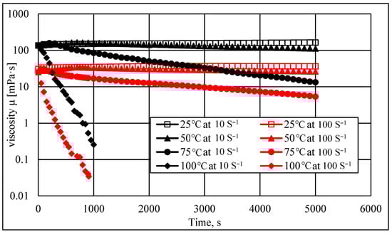 Time-dependent temperature effect on the viscosity at different temperature values.
