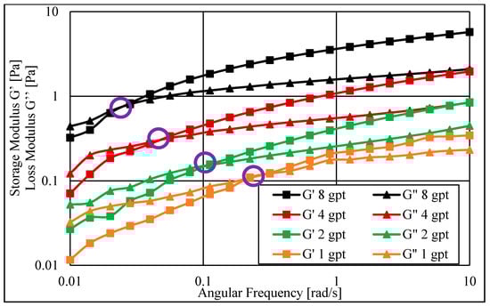 The elastic properties of fracturing fluid are vital to understand and determine because they contribute significantly to the efficiency of proppant transport inside fractures. The elasticity measurements of the HVFRs were made using a variety of fracture fluid concentrations. Relaxation time obtained from rheometer measurements was used to determine the elasticity of the fluid. It can be estimated from the crossover frequency of the loss modulus G″ and storage modulus G′. A long relaxation time means that the fluid has higher elastic properties compared to a fluid with a short relaxation time [32]. Figure 7 shows that the HVFR elasticity increased as the HVFR concentration increased. Relaxation time was 4.4, 9.3, 21.3, and 39.84 s for the HVFR concentrations of 1, 2, 4, and 8 gpt, respectively. Interestingly, compared to the viscosity profile, doubling the concentration of the HVFR from 4 to 8 gpt increased the relaxation time substantially, which implies that the elastic properties of HVFRs are in a similar linear relationship with the increasing concentration of HVFRs.