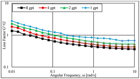 The loss factor describes the two portions of the viscoelastic behavior. Figure 8 presents the loss factor (tan θ) of the HVFR using different fluid concentrations that represent the ratio of the loss modulus (G″, viscous property) to the storage modulus (G′, elastic property). Figure 8 clearly exhibits that increasing the fracture fluid concentration reduced the loss factor as the HVFR concentrations increased from 1 to 8 gpt. Additionally, increases in the angular frequency decreased the loss factor for all HVFR concentrations. The elastic properties of the HVFR also dominated the viscosity properties as the HVFR concentration and angular frequency increased, which can be observed when G″/G′ became less than one.