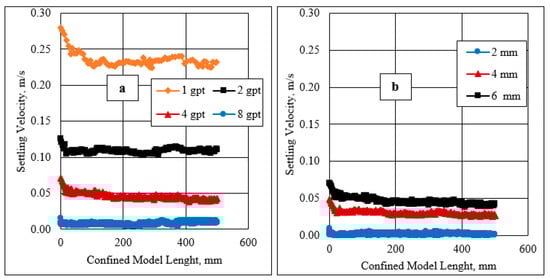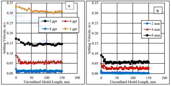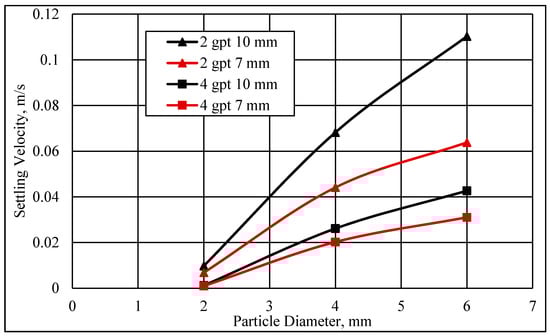 The settling velocity was measured for particles settling in different HVFR concentrations (i.e., 1, 2, 4, and 8 gpt). Three spherical particles (i.e., 2, 4, and 6 mm) were used in this investigation. Figure 9a displays the effect of an HVFR concentration on the settling particles using a 6 mm spherical particle size. The results indicate that the settling velocity was faster at a low HVFR concentration of 1 gpt compared to the high HVFR concentrations of 4 and 8 gpt. That could be due to the impact the HVFR viscosity and elasticity, which can hold particles for a significant time at higher fluid concentrations. Further investigation was conducted to understand the effect of different spherical particle sizes on the particle settling velocity using the HVFR with a 4 gpt concentration. Figure 9b shows that the settling velocity was more rapid for larger particle diameter sizes due to their volumes and weights being larger compared to the smaller particles. The terminal settling velocities of the spherical particles were 0.00133, 0.03167, and 0.05562 m/s for 2, 4, and 6 mm, respectively.