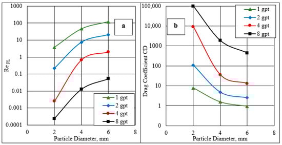 The Reynolds number (RePL) was determined using Equation (1) [33], while the drag coefficient was calculated using Equation (2). The drag coefficient equation should be used if the Reynolds numbers are below 106 [34]. The fluid resistance that prevented the spherical particle from falling is represented by the drag coefficient.