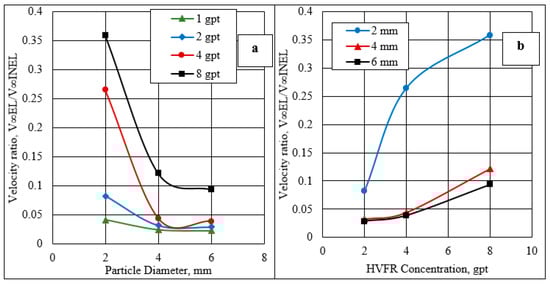Velocity ratio using: (a) friction reducer concentrations and (b) spherical particle sizes.