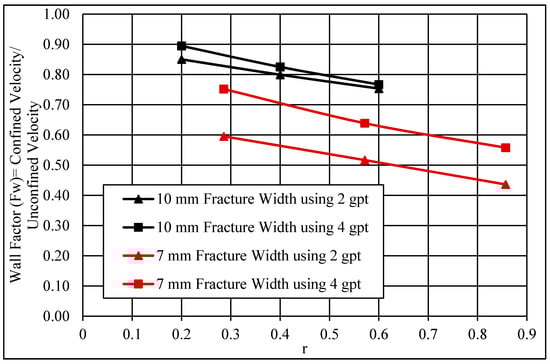 Further analysis of the wall effect was conducted using the settling velocity results presented in Figure 9 and Figure 12 for unconfined and confined fluids. The wall factor is a ratio of the settling velocity of the particle in a confined model to the settling velocity in an unconfined model, as presented in Equation (6) [35]. Figure 14 shows the wall factor (Fw) as a function of the dimensionless diameter (r), where r is the particle diameter over the fracture width. Based on two fracture widths (i.e., 7 and 10 mm), the wall factor decreased with an increase in the value of r. This happened because the impact of the wall retardation increased as the particle diameter size approached the wall spacing sizes. Additionally, unlike Newtonian fluids, the wall effect is not the only function relating the particle diameter to the fracture width ratio; there might be other factors, such as the HVFR elasticity and viscosity.