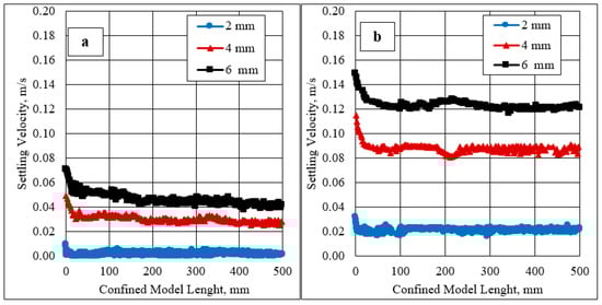 Terminal spherical particle settling in the confined model using (a) 6 mm particle size, and (b) 4 gpt HVFR concentration.