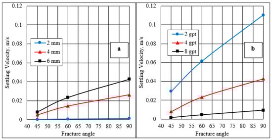 Effect of the fracture angulation on the settling velocity using (a) 4 gpt concentration, and (b) 6 mm particle size.