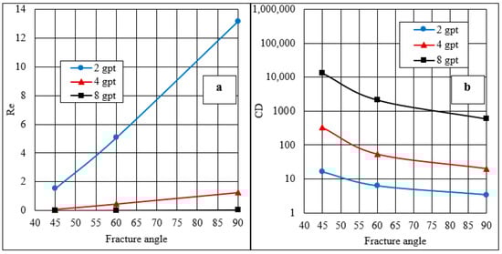 Figure 19a,b show that the fracture angle had a significant impact on the drag coefficient (CD). The drag coefficient decreased as the fracture angle increased to 90°. For all the HVFR concentrations, the CD decreased dramatically when the fracture angle was below approximately 60°, but only an insignificant reduction was observed beyond that.