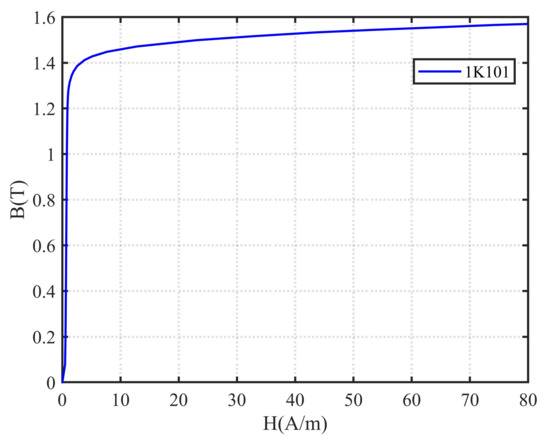 Figure 3 and Figure 4 show the B–H curves of the above two. The inflection point of the magnetic density of 1K101 is lower than that of 20JNEH1200, which means that the saturation magnetic density of the former is smaller.