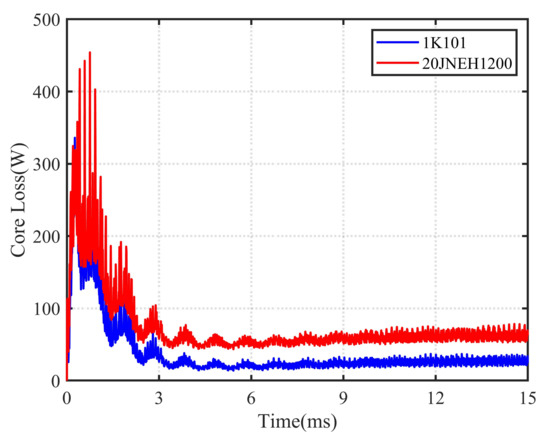 The above two materials are taken as the stator core material respectively. According to the material data sheets of 1K101 and 20JNEH1200 provided by the manufacturer, the core loss calculation coefficients in Equation (12) of the two materials are shown respectively: