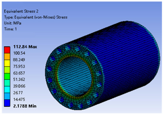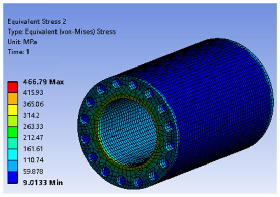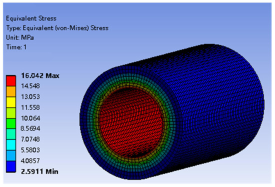 In this section, the motor rotor stress of the laminated rotor and the smooth solid rotor is compared. To maximize the mechanical strength and increase the starting torque, the round slot with two 5 mm end rings is adopted in the laminated rotor structure. The results are shown in Figure 12 and Figure 13. At the rated speed of 59,000 rpm, the maximum stress of the latter appears at the inner surface, which is 16.042 Mpa, while that of the former is significantly increased due to the end rings, which is 100.54 Mpa. However, both of them are less than the yield strength of the materials.