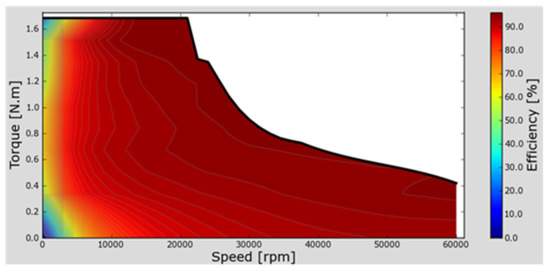 ANSYS Maxwell Toolkit is used to get the motor efficiency MAP diagram. In the simulation, the maximum speed is set as 60,000 rpm. When the motor speed is below the rated speed, the amplitude and the phase angle of the stator current, and the speed are scanned parametrically to simulate working conditions at different speeds and torques; when the speed is over the rated speed, the current power angle changes constantly to simulate different direct-axis demagnetization currents, and the maximum input voltage is taken as the constraint condition to obtain the output characteristics of the motor in the field weakening work area. After obtaining most output and loss data in operating area, the efficiency of the motor under different working conditions is calculated. The efficiency MAP diagram of the motor is obtained in Figure 15.