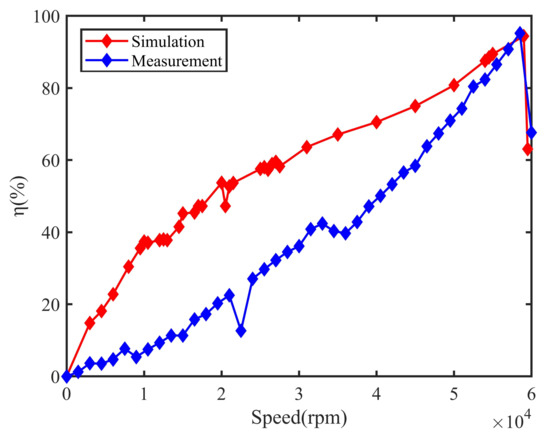 To verify the performance of high-speed amorphous alloy induction motor and prove the validity of the study in this paper, a performance test is conducted. Figure 17 shows the test bench of the motor prototype, mainly including the dynamometer and its controller, driver system, and power supplies. The WH6000 motor dynamometer controller adopts digital synchronous sampling technology and microcomputer technology, and it can accurately measure the speed, torque, power, and efficiency of the motor dynamometer. The performance test was conducted up to 60,000 rpm.