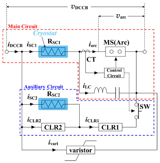 The proposed DCCB uses the superconducting characteristics of HTSC1 to quickly limit the current in case of fault and reduce the power burden of the MS (mechanical switch). At this time, HTSC1 distributes power to dissipate energy, and the auxiliary circuit is configured in parallel with the main circuit to reduce the power capacity of HTSC1.In the auxiliary circuit, two CLRs (current limiting reactor/resistor), a second superconducting element, and a power switch are connected. They reduce the current flowing to the MS to make interrupting faster or to reduce the peak current of the MS. However, since the disadvantage of increasing the breaking capacity of the power switch exists at the same time, an overall analysis according to the parameter characteristics of the CLR is required [9,10,11].