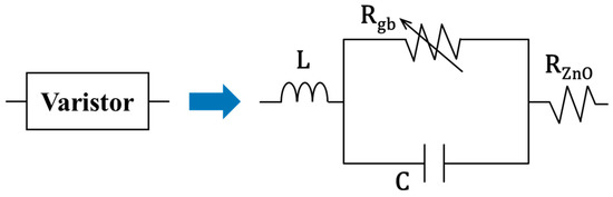 The equivalent circuit of the varistor is composed of a series resistance and a capacitor, as shown in Figure 2 below. The series resistance is the ZnO grain resistance RZnO and is constant, but Rgb is the resistance of the intergranular boundary, which follows Equation (7) above. L is an inductance of conducting leads, and C denotes the capacitance of the intergranular boundary.