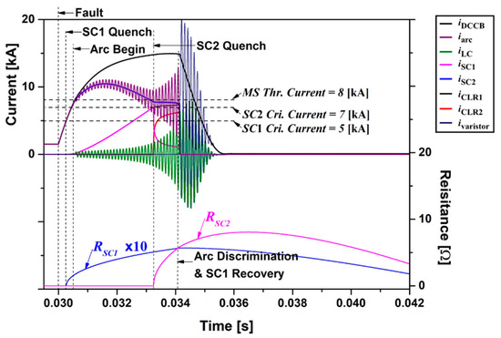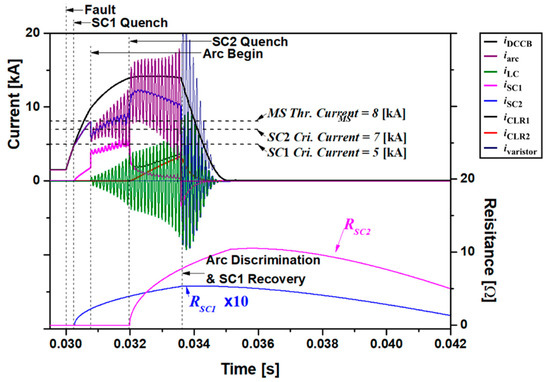 In Section 2, the element modeling and operation process of the proposed superconducting hybrid DCCB and how the CLR impedance setting affects the overall operation process are reviewed. In this section, we review the simulation setting conditions and the case-by-case results.