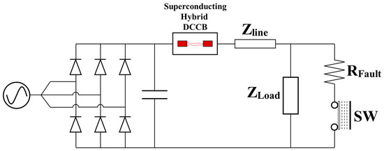 Figure 5 is a simulated DC system for verification of the proposed superconducting hybrid DCCB. It is converted to DC using a three-phase rectifier from the AC grid and smoothed using a capacitor to make it closer to DC. In the DC terminal, it is connected to the load ZLoad through the DC line impedance Zline and the fault resistance RFault, and the closing switch is connected in parallel with the load to simulate a fault. Detailed parameters of the DC system are listed in Table 1. And the modeling parameters of the proposed superconducting hybrid DCCB are specified in Table 2.