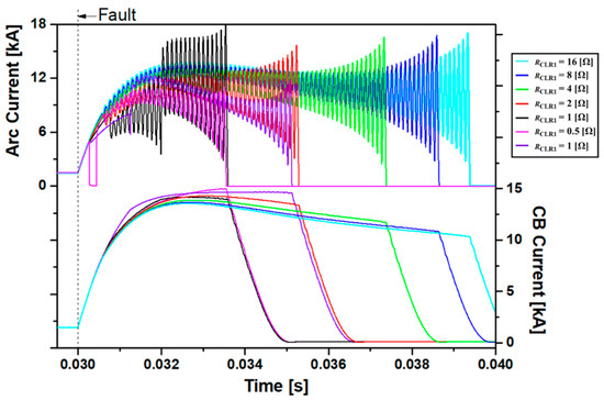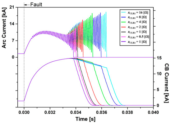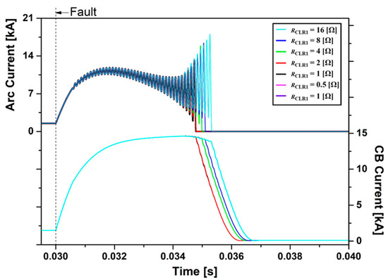 The circuit using inductance for CLR1 and resistance for CLR2 shows relatively good results. Although the interrupting time is slow, the peak of arc current decreases to a large value. In this case, the smaller the resistance and inductance, the shorter the interrupting time (arc dissipation time). However, the peak of the arc current does not show a constant aspect. The aspect is that the smaller the resistance, the smaller the peak of the arc current, but there are many exceptions. Table 3 and Table 4 below describe the interrupting time and peak of arc current results according to the case study.