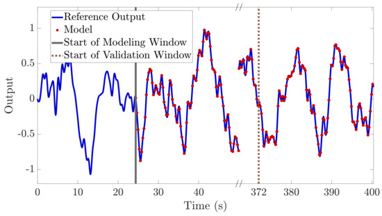 The experiments showed that RTVF recovered the system poles almost exactly, with a set distance for all 29 test cases. Similar results were obtained from the output errors: both and were less than . As Figure 1 shows, there is no practical difference between the model and the output data samples. In this idealized setting, we conclude that the performance of RTVF is excellent across all investigated metrics.