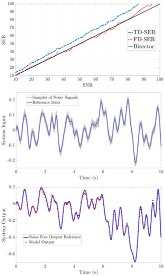 For any fixed SNR level, we computed the time-domain TD-SER by averaging the performance induced by (41) over the R models and the two output signals. The frequency-domain FD-SER was computed in the same way, by averaging over the transfer matrix elements. These two metrics are shown in the top panel of Figure 2.