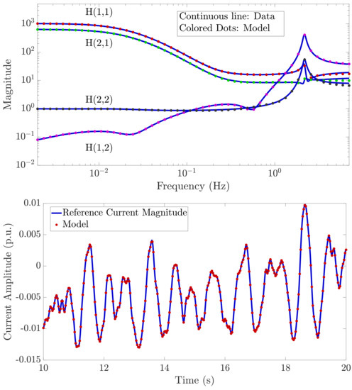 The black-box identification of dynamic models from time series data goes far beyond power system applications and is regarded as a well established field [26,27]; popular algorithms include the Multivariable Output Error State Space (MOESP) and Numerical algorithms for Subspace State Space System Identification (N4SID) techniques [28]. As noted, one prominent approach is the Time-Domain Vector Fitting (TDVF) scheme [26,29,30]. This approach is applicable for estimating rational models of linear systems, starting from the time domain samples of input and output data. Unfortunately, canonical TDVF has the following restrictions: