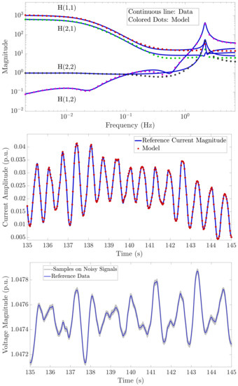 Top and middle panels of Figure 5 report the frequency- and time-domain fitting performance of a RTVF model of order obtained for dB. The corresponding noise-corrupted voltage magnitude signals are depicted in the bottom panel. Compared to the performance in the noise-free setting (Figure 4), these results show that the frequency-domain model accuracy is still quite acceptable, and that the accuracy in the time domain seems to be not affected by the presence of noise. Therefore, we conclude that the time prediction capabilities of RTVF models extracted from noisy signals are potentially adequate for power system applications.