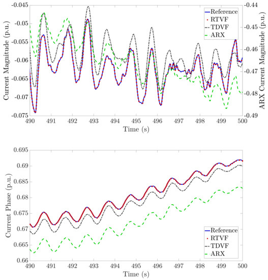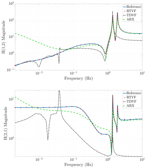 The results are shown in Figure 7, where we compare the accuracy of the models in terms of output current magnitude and phase (time domain). The results we provide are referred to time domain validation data, that were not used for model generation, and that are therefore meaningful to validate the models’ respective qualities; for the sake of visualization, we used a different y-axis scale for the current magnitude signal returned by the ARX model (right y-axis in the figure top panel). We observe that the proposed RTVF method outperforms ARX and TDVF algorithms, providing highly accurate predictions. We remark that, in principle, the application of TDVF in its standard formulation is not even conceivable in the considered scenario due to the presence of concurrent inputs, which were here handled by means of the proposed modified scheme of Section 6. Nevertheless, the experiments confirm that including the effect of the initial conditions is crucial to deriving a meaningful model. This is even more evident when the frequency responses of the models are compared with those of the reference system, as reported in Figure 8 for the two off-diagonal elements of the transfer matrix; the remarkable accuracy of the RTVF model is not achieved by the ARX and TDVF algorithms.