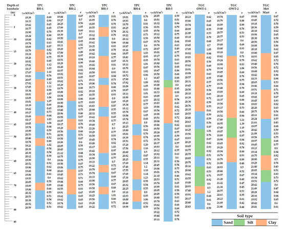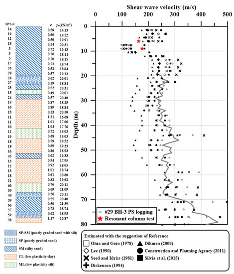 By reclassifying the unified soil classification profiles in Figure 9, according to the aforementioned method, it was possible to determine the shear wave velocity of each soil layer. The moist unit weight (γm) and void ratio (e), which were computed based on water content (w) and specific gravity (Gs) obtained from borehole data, are listed next to each soil profile.