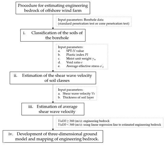 A procedure for estimating such a ground model is presented in this section. Figure 2 shows the flowchart of the procedure, which includes four steps: In the first step, the soils of each borehole are classified by means of the Unified Soil Classification System (USCS). In the second step, the shear wave velocities of soils are estimated with the semi-empirical formulation developed based on PS logging. In the third step, the average shear wave velocities of soils within 30 m Vsd30 are calculated to determine the depth of the engineering bedrock. In the final step, the engineering bedrock is mapped to the three-dimensional ground model of the offshore wind farm. Descriptions of each step are provided in the following sections.