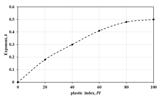 With the shear wave velocity, soil density, and void ratio of each soil in Figure 1, the shear wave velocity of soils could be calculated using Equation (5), which was derived from the maximum shear modulus, G0, in Equation (6) and the semi-empirical formulation for calculating the maximum shear wave velocity suggested by the DNV (2002) [11], where ρ (kg/m3) is the density of soil (ρ = γm/g); (kN/m2) is the average effective stress at each depth, which can be calculated according to the thickness of the soil layer and the effective unit weight; e is the void ratio; OCR is the over-consolidated ratio; and A is an empirical parameter that varies with the particle size of soil and shape of the particles. The DNV (Det Norske Veritas) (2002) [11] suggested adopting the value of A as 3000 ± 1000. The parameter k is a function of the plastic index, PI, as shown in Figure 3. The semi-empirical parameter (A) for each engineering soil can be obtained through Equation (5) by using the shear wave velocity obtained from the PS logging test (Figure 1).