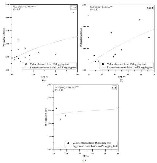 Relationship between the shear wave velocity and SPT-N obtained in the field test of borehole BH-3 in #29 offshore wind farm (a) Clay, (b) sand, (c) silt.