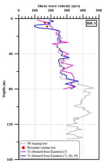 The profiles of shear wave velocity in borehole #29 BH-3, calculated using the semi-empirical parameters A (from the PS logging test; Table 2) are shown in Figure 5. The estimated results of Equation (5) showed good agreement with the PS logging test results. The soil shear wave velocities calculated using Equations (7)–(9) are shown as blue lines in Figure 6. The difference between the estimated value and the PS logging test results was found at a depth greater than 30 m. This difference may have come about because the SPT-N only roughly presented the effects of soil density and hardness.