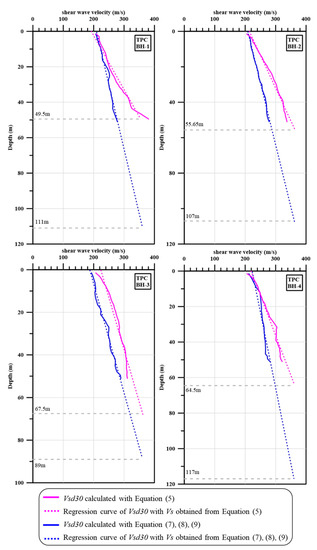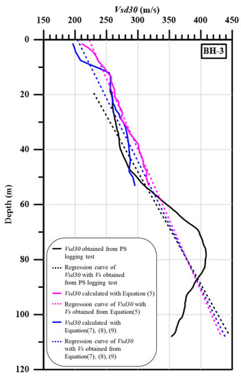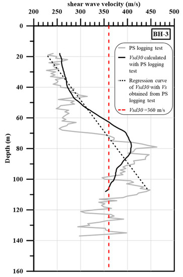 Figure 7 shows the average shear wave velocity (Vsd30) calculated using the shear wave velocity obtained from the semi-empirical formulation; that is, by Equations (5), (7)–(9). The dotted lines are the linear regression curves of the average shear wave velocities. The depth of engineering bedrock determined by the linear regression of Vsd30 obtained from the PS logging test (dotted black line) was 75 m. The depth of bedrock estimated with the linear regression formulation of Vsd30 using the Vs calculated with Equation (5) and parameter A in Table 2 was 80 m (dotted red line). The depth of bedrock estimated with the linear regression formulation of Vsd30 using the Vs calculated with Equations (7)–(9) was 74 m (dotted blue line).