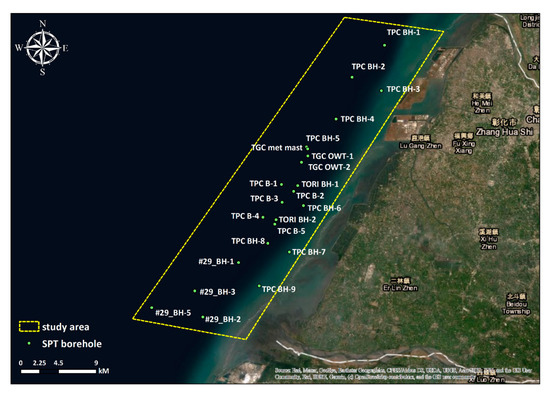 We collected a total of 23 SPT borehole data sets published for the Changhua area, including 16 from the Taipower offshore wind farm (TPC), 3 from Fuhai offshore wind farm (Taiwan Generations Corp., TGC), and 4 from offshore wind farm #29. Among these, 5 sets of data from the Taipower offshore wind farm were removed in the subsequent shear wave velocity calculation due to a lack of relevant parameters. The distribution of boreholes is shown in Figure 8. The depth of each borehole ranged from 0 to 120 m. According to the unified soil classification system (USCS), the soil in Changhua area is mainly composed of silty sand (SM), low-plasticity clay (CL), and low-plasticity silt (ML) with thin layers of poorly graded sand with silt (SP–ML) and silty clay (CL–ML). The distribution of soil profile is shown in Appendix A, with SPT-N values to the left of each soil profile.