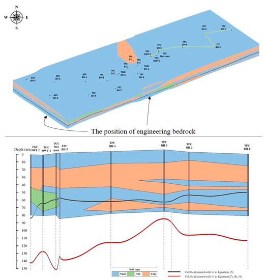 We developed a ground model using the 18 boreholes in the offshore area of Changhua (given in Appendix A). In Figure 11, we present the boreholes TPC BH-1, TPC BH-2, TPC BH-3, TPC BH-4, TPC BH-5, TGC tower, TGC OWT-1, and TGC OWT-2, from north to south (dotted yellow line) and the two-dimensional soil profiles of the offshore wind farms. The area of the ground model is given in Figure 8, the length of which was 41 km in the north–south direction, while that in the east–west direction was 13 km. Figure 11 shows the depth of the engineering bedrock in the Changhua area, as estimated by Equation (5) using the parameter A in Table 2 (black line), which varied from 49.5 to 83 m. The depth of the engineering bedrock estimated by using the average shear wave velocities calculated by Equations (7)–(9) is presented as a red line in Figure 11 and varied from 44 to 150 m. The estimated depth of the engineering bedrock mainly depended on the accuracy of the estimated soil shear wave velocity. The depth of engineering bedrock obtained by the linear regression (red line) may exceed the borehole depth, as shown in Figure 11, for which no soil information can be provided.