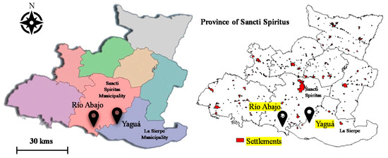 Sancti Spiritus province has a great diversity in its relief, making electrification difficult through the national grid extension in rural areas. In this province, 28% of the population lives in scattered rural settlements, with a population density of only 15 inhabitants/km2. This situation was caused by the constant migration to the main cities outside the province because of the lack of public services such as electricity. The communities of Yaguá and Río Abajo were electrified through different technologies within the rural electrification process in Cuba, and they are 14 km from each other (Figure 1).