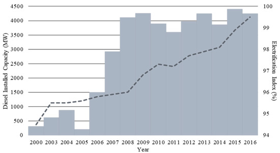 In 2005, there was a low rural electrification rate in Cuba and seven large and inefficient oil-fed power plants, with an average lifetime of 25 years, began to suffer frequent interruptions. These failures appeared during peak demand, due to lack of maintenance and poor fuel quality, causing corrosion and failure of the pieces. Therefore, in 2006, the Cuban authorities stated a national power grid and generation matrix transformation called “Energy Revolution” that included the acquisition of new gas-fired power plants and more efficient turbines and diesel generators [35]. Distributed Generation (DG) was widely spread with small and medium-sized diesel power plants, which would substitute the big old power plants. Currently, there are 6000 small diesel generators (1320 MW) and 416 fuel generators (904 MW), in addition to 893 high-efficiency diesel generators (1219.8 MW) for rural electrification in distribution grids [16]. This diesel-based DG program was only possible thanks to economic agreements between Cuba and Venezuela. In 2012, 47% of the total imports of goods and services in Cuba corresponded to Venezuelan fuel, with a total annual value of 6.4 billion dollars [21]. The installed capacity increased 10-fold between 2005 and 2008, and the electrification rate in Cuba overcame the previous stagnation, around 95%, to reach 99.6% in 2016 (Figure 2), which was the last year of reliable data found [21]. Contrary to what may be thought, in most developing countries, the rate of rural electrification and installed capacity are not indices whose growth is uniform and constant. In the case of electrification indices, the variations are due to changes in technology that occur at a slower speed than that necessary to achieve an immediate transition from one electrification system to the other. In addition, specific shortages in the supply of fuel for systems based on generator sets have an influence, which is something that is very important in Cuba. Regarding installed capacity, in Cuba, the migration process from old to new thermoelectric technologies was not immediate. In this sense, some generation systems went out of service before replacement, and this causes fluctuations in installed capacity.