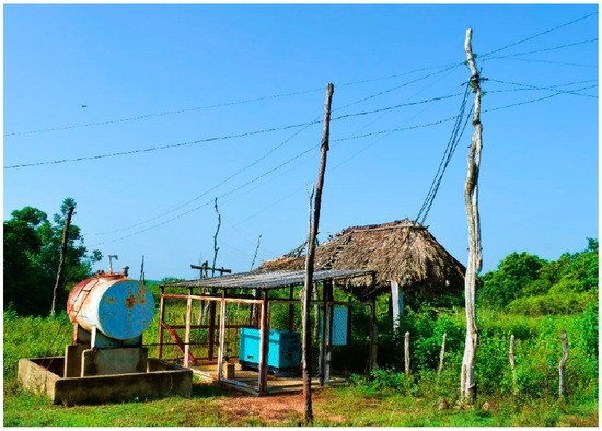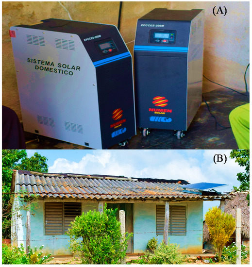 Currently, Río Abajo is a community of 50 houses. The young inhabitants travel during the week to study in the nearest cities, while the elders stay within the community working in agriculture and livestock. The most widespread products are onions and bananas, which are gathered in the community center and then sold to the most important cities and population centers in the province of Sancti Spiritus. The MPS is totally portable, so there is no need for excessive wiring in the houses, and the panels are installed on the roof (Figure 6). The visual impact of the panels is very limited, since they can be installed on the roof of the houses without needing additional buildings or infrastructure. In addition, note that although the roof structure might seem weak to support the panels’ weight, no issues in this regard were reported during the field visits. The operation and maintenance are carried out by the state-owned Cuban electricity company. The houses are scattered over an area of 180 ha (1.8 km2). The area has a length of 2.5 km and a maximum width of 900 m and extends alongside a small river that leads to a reservoir used for irrigation. Therefore, a low-voltage diesel or RET-based microgrid would have voltage regulation problems due to the long distances between houses, so only domestic electrification is possible.
