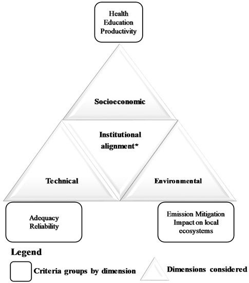 Sustainability assessment dimensions and criteria [31]. (*) The institutional dimension is shown through the unique criterion considered in this regard.