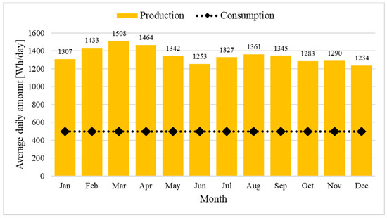 With regard to the adequacy, the average consumption of 3.42 kWh/day per house is estimated from household appliances, the number of usage hours in Yaguá, and the load surveys carried out. These results show a consumption that is 45% lower than the average consumption of rural homes in Cuba [51]. On the other hand, if it is compared with the minimum adequacy threshold, it turns out that the estimated value of 1248 kWh/year is five times higher than that value proposed by the IEA. In this sense, the generator of the Yaguá community has been sufficient to cover basic demand in terms of electricity supply. However, it is still insufficient to satisfy the minimum demand necessary for sustainable development, as calculated by the Cuban government, in rural households. Therefore, the performance of the Yaguá generator in terms of electricity supply has been enough to cover basic demand, but it is not enough to cover the amount calculated by the Cuban government as necessary for a comfortable life in rural households. In Río Abajo, the daily average energy demand is estimated at 496 Wh/day, including an average power demand of 20.7 W and a peak power demand of 136 W. This is not even 10% of the minimum requirements for rural electrification in Cuba. Additionally, the load factor is 0.152 due to the partially discretized values of the demand because of the low number of house appliances. MPS-300 produces 491 kWh/year, which is high enough to supply the 181 kWh/year of electrical consumption. However, considering the average solar radiation of 5.52 kWh/m2/day, the PV module is working at a capacity factor of 19.4%, and the average daily generation is 1.34 kWh/day. Therefore, there is an excess of generated energy not being used for household needs. Figure 8 shows the average daily production and consumption in Río Abajo. The former is significantly higher than the latter over the entire year. As a result of Cuba’s location, only small production variations are observed, while consumption remains constant and mainly destined to illumination and communication purposes.