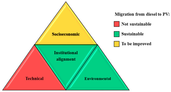 In order to sum up the comparison of the electrification projects of Yaguá and Río Abajo, Table 3 shows all the indicators considered for the evaluation criteria of the sustainability dimensions. In addition, Figure 9 illustrates the sustainability of the migration from diesel to PV systems on a triple-scale (green: sustainable; red: not sustainable; yellow: to be improved). Although the sustainability is not guaranteed regarding the technical dimensions and no clear advantages are identified in the socioeconomic dimension, results show the sustainability of the migration from diesel to PV-based technologies in terms of the environmental and institutional dimensions. Thus, the recommendations detailed in the previous subsections to strengthen the technical and socioeconomic dimensions would allow the complete achievement of sustainability in the energy transition.