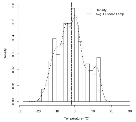 The approach used here is to ‘bin’ the outdoor temperature data within a meter period into discrete temperature bands, determining the probability density of the outdoor temperature in each of the discrete bands over one energy consumption meter period. The idea is that it is not just the mean temperature in a meter period that is important. Rather, the record of temperature variation in a meter period is even more important, especially if the thermostat set point temperature is changing within the meter period.