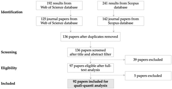 Figure 1 illustrates the delimitation of the paper sample. The chosen search strings led to 192 publications in the Web of Science and 241 publications from Scopus. These databases were consulted in January 2021. We adopted a rigorous methodology for generating a consistent set of papers, and to increase relevance of conserved publications, only journal articles were included for data extraction, resulting in 125 and 142 papers in each database, respectively. This means that book chapters, conference papers, and other publications that were not included as journal papers were excluded from data analysis. This is justified to increase the review reliability thanks to the peer review process carried out for the assessment of submissions for journal paper publication. As such, we believe that the application of our strategy resulted in a rigorous way to identify a consistent set of selected publications and allowed us to find the main concepts relevant to the analysis of the investments in battery energy storage systems. Considering that the chosen databases include overlapping journals, 136 papers were found as unique papers. This sample was extracted from the databases as electronic spreadsheets to enable Step 3 (assessing the quality of studies).