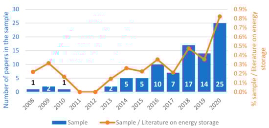 Data analysis started answering RQ1 (what are the main characteristics of the literature regarding economic analysis of BESS?) to provide an initial and general understanding of this literature. Figure 3 shows the yearly distribution of the paper sample (92 articles), indicating growing interest in studies on economic analysis of BESS, especially since 2016. This figure shows a growing number of publications specifically interested in economic analysis of BESS when considering the literature on ESS in general (orange line in Figure 3).