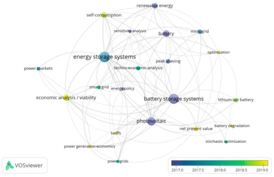 Figure 5 presents the authors’ keywords co-occurrence built using the VOSViewer software [16]. It shows keywords that were used at least three times by the papers in the sample. In this network, node size represents the number of times these keywords were used by the papers, the lines between them indicate that these keywords were used by the same publication, and the colors show the median of the publication year regarding the associated papers. Thus, Figure 5 highlights the relevance of the topics “photovoltaic” and “renewable energy”, as they are large nodes, even if they were not used as search strings. This network also shows the yellow nodes as possible “hot topics” for the field, as they represent more recent research interests, including tariffs, economic analysis/viability, net present value, and lithium-ion battery.