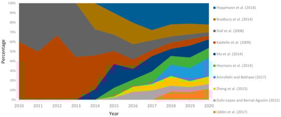 Complementing Table 1, Figure 6 shows the distribution of the most cited papers over time. Even though these ten publications influence the literature, there are some trends that can be identified. For instance, although Diaf et al. [18] and Kaldellis et al. [21] have high absolute number of citations, Figure 6 provides a tendency that these publications may relatively reduce their influence on more recent publication given percentage decrease of citations over the years. On the other hand, Hoppmann et al. [17] seems to be still influential also in recent publications. Despite being more recent, Amrollahi and Bathaee [25] also shows relevant influence in the academic publications, as it is relatively highly cited by recent publications.