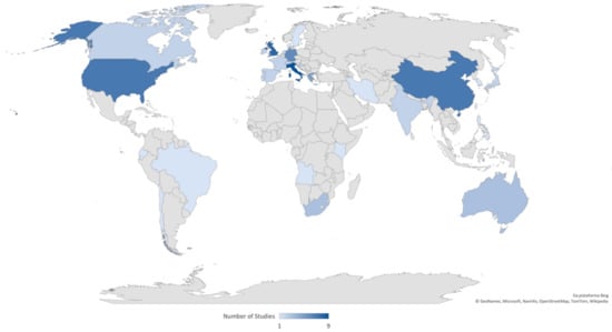 Figure 7 brings the distribution of studies in terms of countries. The content analysis of the paper sample identified the location chosen by the researchers to perform the economic analysis of systems involving BESS. Most frequent countries are Italy (nine papers), United Kingdom (nine papers), China (eight papers), United States (seven papers), Germany (six papers), and Greece (five papers). This concentration of publications in Europe, USA, and China indicates opportunity for more studies in other locations. Interesting insights can emerge from studies on context specific factors influencing economic viability of energy systems integrated to BESS as well as on comparison between factors associated with different locations.