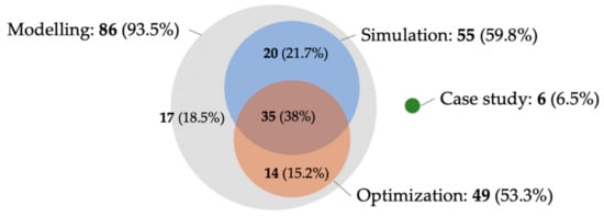 Still in terms of literature characterization, the content analysis also indicated the most frequent research methods used by the paper sample (Figure 8). Mathematical modelling seems to be the most preferred method by the researchers (86 papers, corresponding to 93.5% of the paper sample), which can be combined with simulation (55 papers), optimization (49 papers), or both (35 papers).